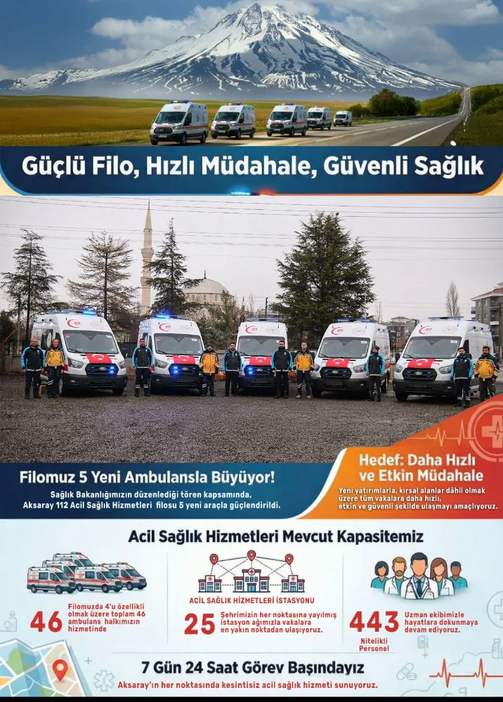 Milletvekili Hüseyin Altınsoy, Aksaray’a kazandırılan 5 yeni ambulansın düzenlenen törenle hizmete alındığını duyurdu. Aksaray 112 Acil Sağlık Hizmetleri, şehir merkezi ve kırsal alanlar dâhil olmak üzere il genelinde 25 Acil Sağlık Hizmetleri İstasyonu ile vatandaşlara en yakın noktadan hizmet sunuyor. Güçlü ambulans filosu ve yaygın istasyon ağı sayesinde vakalara hızlı, etkin ve güvenli şekilde müdahale ediliyor.