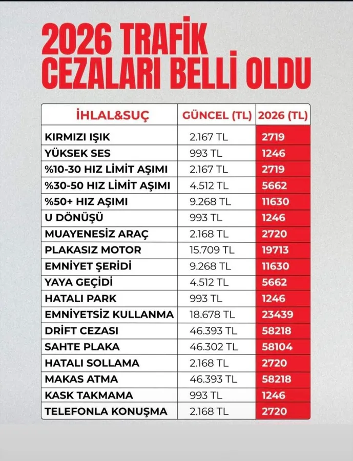 Özellikle yüksek risk taşıyan ve trafikte tehlike yaratan ihlallere verilen cezalara ciddi zam geldi. Güncel olarak 46.393 TL olan drift cezası, 2026 itibarıyla 58.218 TL’ye çıkacak. Makas atma cezası da 58.218 TL olurken, sahte plaka cezası 58.104 TL, plakasız motor 19.713 TL ve emniyetsiz kullanmanın cezası ise 23.439 TL olacak.