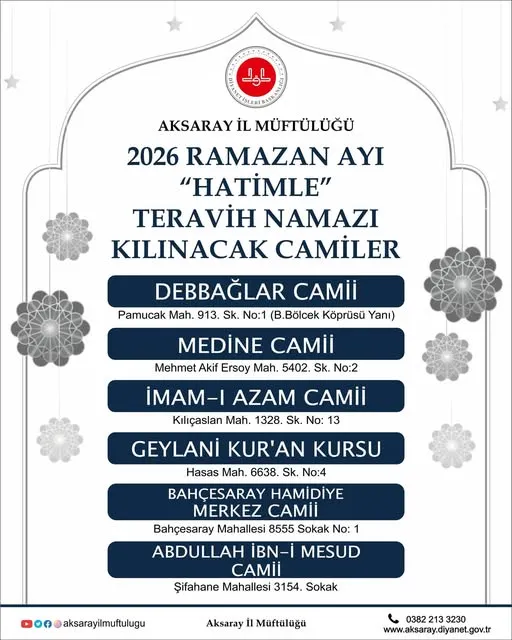 2026 Yılı Ramazan Ayı, İlimizde Hatimle Teravih Namazı Kılınacak Camiler açıklandı