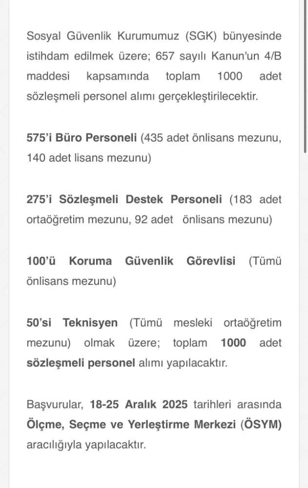575 Büro Personeli 275 Sözleşmeli Destek Personeli 100 Koruma ve Güvenlik Görevlisi 50 Teknisyen Başvurular ÖSYM üzerinden yapılacak. KPSS puanı esas alınarak sıralamaya göre alım yapılacak. Mülakat yok!