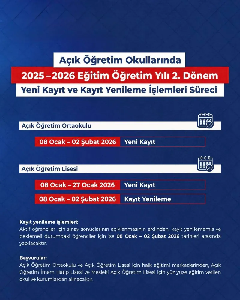 Açık Öğretim Okullarında 2025–2026 eğitim öğretim yılı 2. dönem için yeni kayıt ve kayıt yenileme işlemleri Ocak–Şubat 2026 tarihleri arasında yapılacak