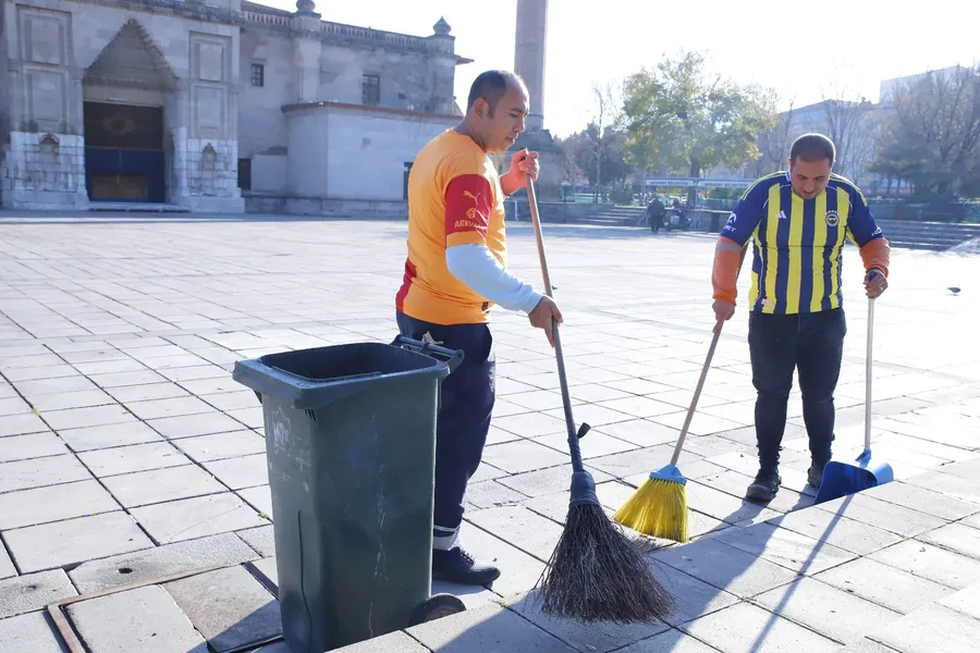 Aksaray Belediyesi Temizlik İşleri Müdürlüğü’nde görev yapan Hazret Özkanlı (35) ve Ferdi Yılmaz (27), tuttukları takımların formalarını giyerek işe geldi.
