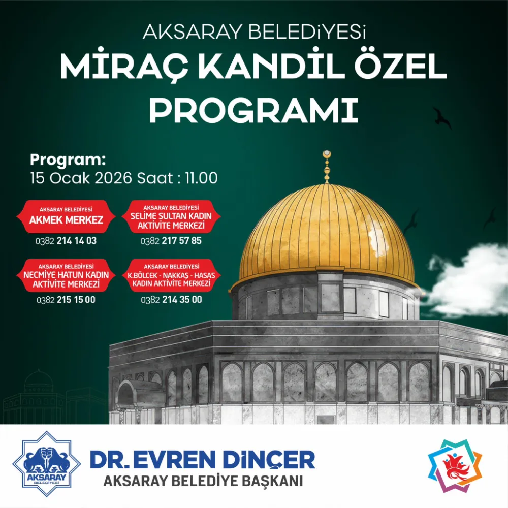 Aksaray Belediyesi tarafından yıl boyunca sürdürülen sosyal ve kültürel çalışmalar kapsamında düzenlenen bu programla, manevi gün ve gecelerin toplumsal birlik ve beraberliğe katkı sunan yönünün güçlendirilmesi hedefleniyor. Özellikle kadınların sosyal yaşam içerisinde daha aktif yer almasına katkı sağlayan AKMEK ve Kadın Aktivite Merkezleri, bu tür etkinliklerle aynı zamanda manevi paylaşımlara da ev sahipliği yapıyor. Miraç Kandili Özel Programı’nın, katılımcı kadınlara huzurlu bir ortamda manevi bir paylaşım imkânı sunması, dayanışma ve kardeşlik duygularını pekiştirmesi bekleniyor.