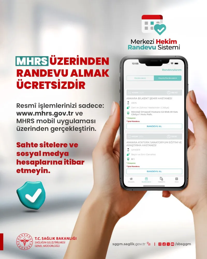 Bakanlığımızın randevu sistemi olan Merkezi Hekim Randevu Sistemi (MHRS) üzerinden randevu almak, iptal etmek veya değiştirmek tamamen ücretsizdir.