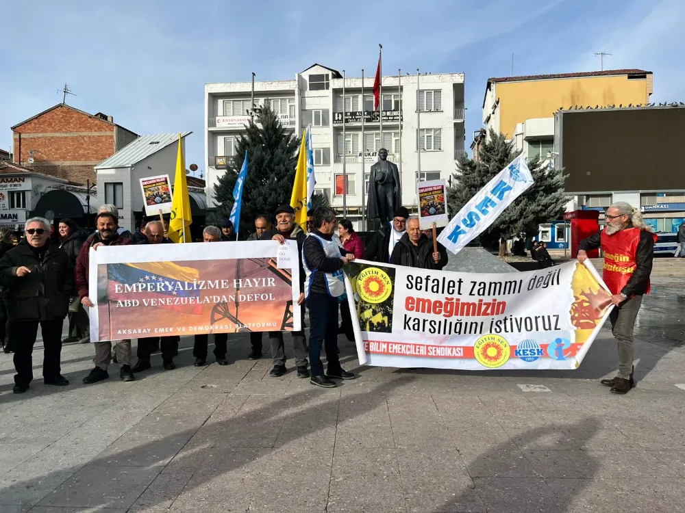 Aksaray’da Eğitim ve Bilim Emekçileri Sendikası (Eğitim-Sen) Şube Başkanı Şevket Köksal ve sendika üyeleri, 15 Temmuz Milli İrade Meydanı’nda basın açıklamasında bulunarak, Türkiye İstatistik Kurumu (TÜİK) enflasyon verilerine tepki gösterdi ve ABD’nin Venezuela’ya yönelik saldırısını kınadı.