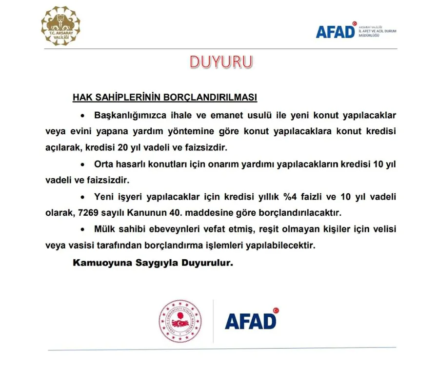 06.02.2023 tarihli Kahramanmaraş merkezli deprem afetlerinden etkilenen Hatay, Kahramanmaraş, Malatya, Adıyaman, Gaziantep, Diyarbakır, Elazığ, Osmaniye, Şanlıurfa, Adana ve Kilis il merkezleri ve ilçelerinde 7269 sayılı Kanun kapsamında hak sahibi kabul edilen ve 19.06.2025, 15.08.2025, 21.08.2025, 06.09.2025 ve 26.09.2025 tarihlerinde yapılan noter kuraları ile kendilerine konut çıkan vatandaşlarımızın açık borçlandırma işlemlerinin 21 Ekim 2025 – 19 Aralık 2025 tarihleri arasında 81 İl Afet ve Acil Durum Müdürlüğümüzde yapılması gerekmektedir.