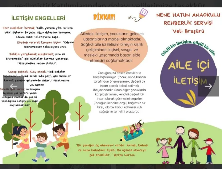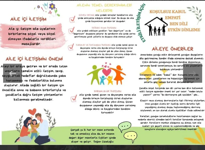 Aile, çocuğun kendini güvende hissettiği, sevgiyi ve saygıyı ilk kez öğrendiği en önemli yerdir. Sağlıklı aile içi iletişim, bireylerin duygu ve düşüncelerini açıkça ifade edebilmesiyle başlar. Çocuğun gelişimi için en güçlü destek, dinleyen, anlayan ve değer veren bir aile ortamıdır.Çocuğun güçlü iletişim becerileri ailede başlar. Sevgiyle kurulan her kelime, güvenli bir gelecek için temeldir. Okulumuz rehber öğretmeni Hilal ALP tarafından “Aile içi iletişim ve Çocuklarda Davranış Yönetimi”konulu eğitim verilmiştir.Katılımlarından dolayı velilerimize teşekkür ediyoruz.