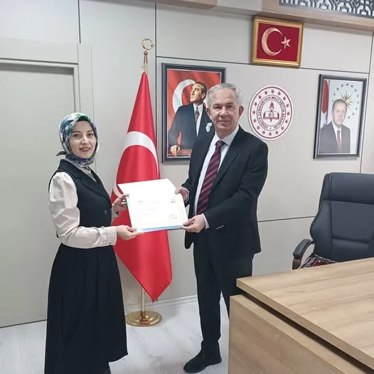 İl Millî Eğitim Müdürümüz Sayın Metin Alpaslan, Necmiye-Mehmet Yazıcı Kız Mesleki ve Teknik Anadolu Lisesi Din Kültürü ve Ahlak Bilgisi Öğretmeni Tuğba Candan’a, “Maziden Atiye – Köklü Geçmişten Güçlü Geleceğe” projesi kapsamında göstermiş olduğu çalışmalardan dolayı başarı belgesi takdim etti.