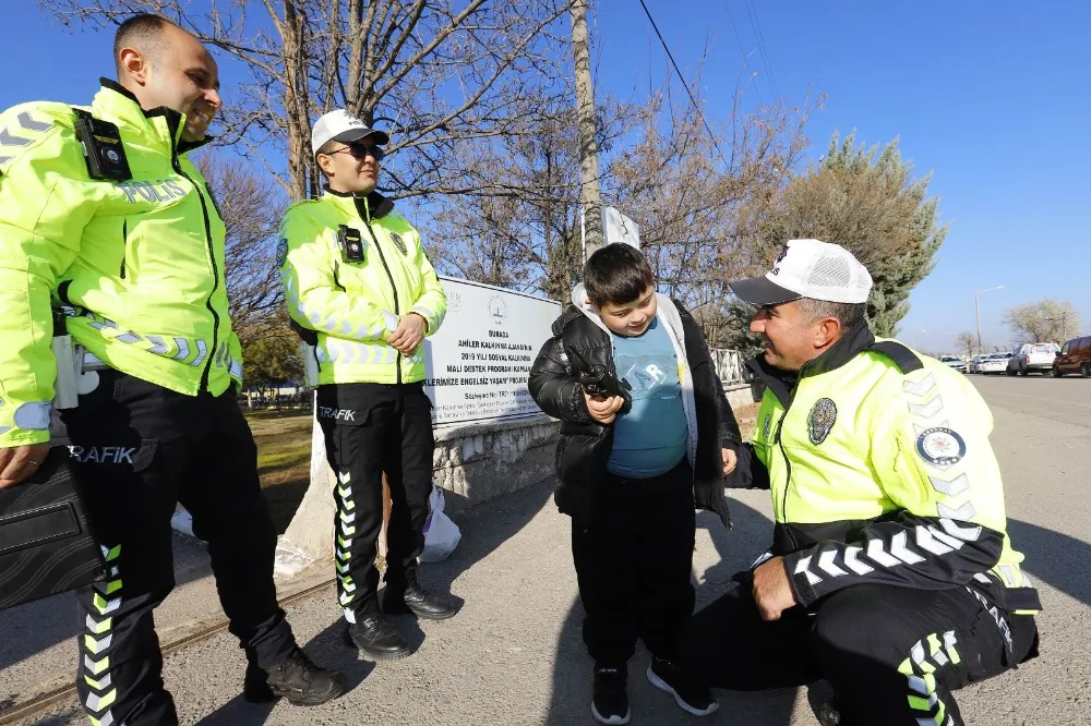 Trafik polisi Cumali Kandemir polis şapkasını özel çocuk Hamza’ya giydirdikten sonra telsizi de çocuğun eline vererek birlikte anons yaptı. Birkaç dakikalığına da olsa “polis” olan özel çocuk Hamza’nın yaşadığı sevinç görülmeye değerdi.