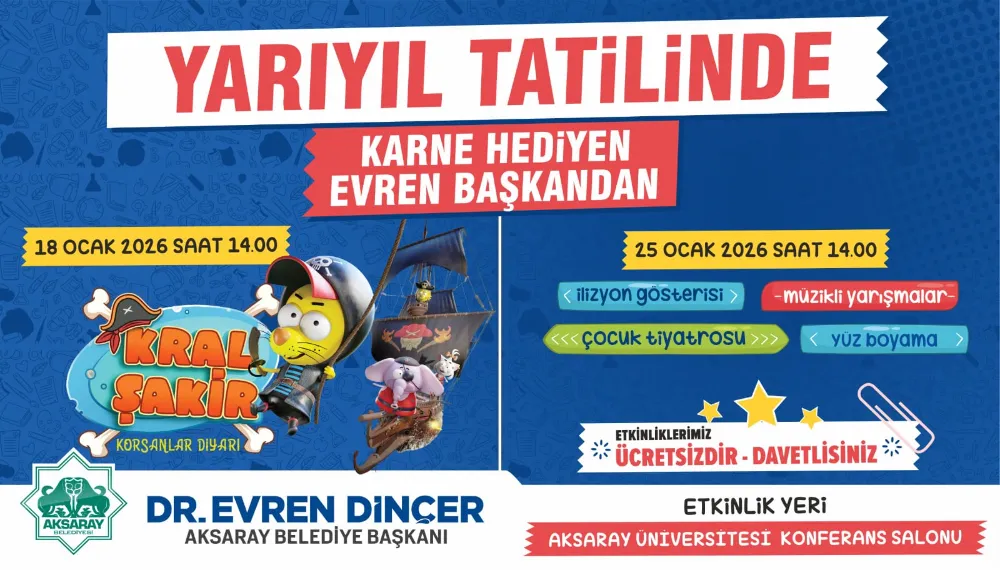Aksaray Belediyesi yarıyıl tatiline giren öğrenciler için Aksaray’da karne sevinci çeşitli etkinliklerle gerçekleştiriyor. Belediye Başkanı Evren Dinçer, çocukların tatil sürecini verimli ve keyifli geçirmesi amacıyla birbirinden renkli etkinlikler organize ettiklerini ifade etti.